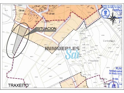 V00301. Se vende solar, en el lugar de Traxeito, ayuntamiento de Dodro, provincia de La Coruña. Tiene una superficie total de 1.817 m², según datos catastrales. Según el Plan General de Ordenación Municipal, 763 m² de la parcela se encuentra en Suelo de Núcleo Rural (SNR), Area de Expansión, Grado 2 y 1.054 m² en Suelo Rústico de Protección de Aguas (SRPAU). La parte de la parcela en la que se puede construir es la de (SNR). La parcela se encuentra aproximadamente 1,5 quilómetros de la vía rápida AG-11, Padrón - Ribeira, a 6 quilómetros de la N-550, La Coruña – Vigo y a 7,5 quilómetros el acceso a la autopista AP-9 La Coruña – Vigo.